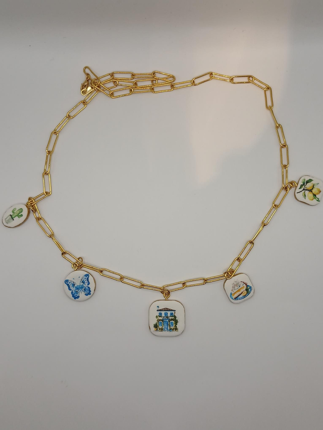 A beautiful handcrafted charm necklace. The charms have been made from polymer clay on a gold plated link chain.