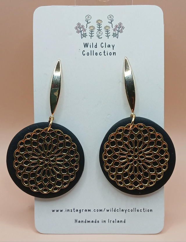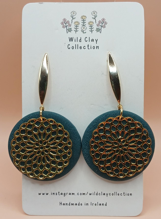Beautiful dangles with gold rosette style. Made from polymer clay and stainless steel with gold plating.