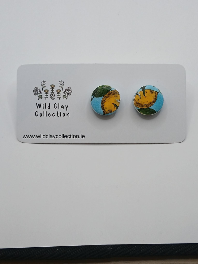 Lemons in a small stud earring form, made with polymer clay and a stainless steel finding.