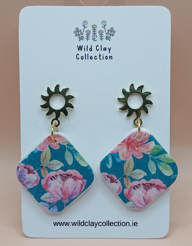 Marianne calls the Sun, a beautiful pink and green floral piece. Made from polymer clay with a gold plated stainless steel sun style earring top.