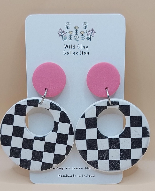 The Retro Dangle Earring is made from Polymer Clay with stainless steel backing. Pink top with checkered pattern.