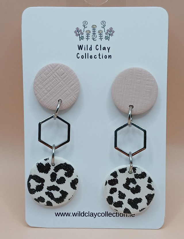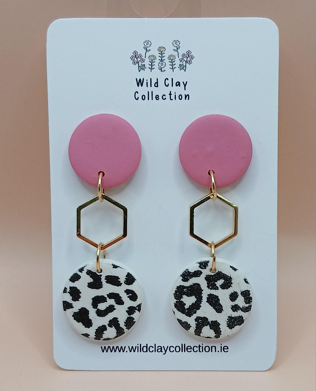 The Print Dangle Earring is made from Polymer Clay with stainless steel finding. Two colours - Pink with a gold hexagon and a pale pink with a silver hexagon.