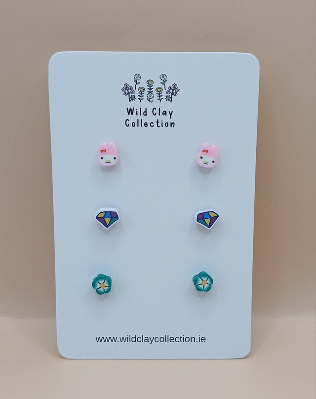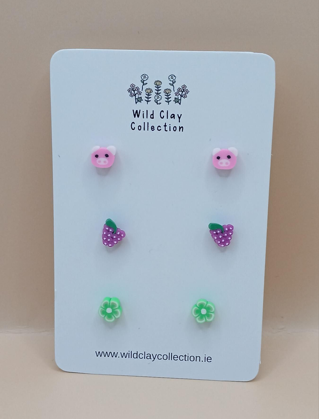 Tiny Stud packs made from Polymer clay with a stainless steel finding and silicone backing.