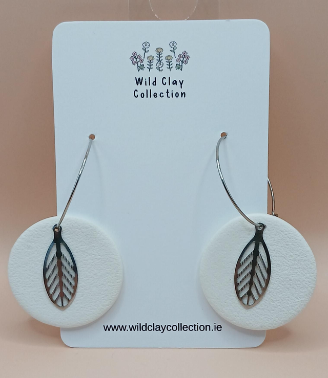 White Circle leaf, made from polymer clay with a stainless steel wire finding hoop.